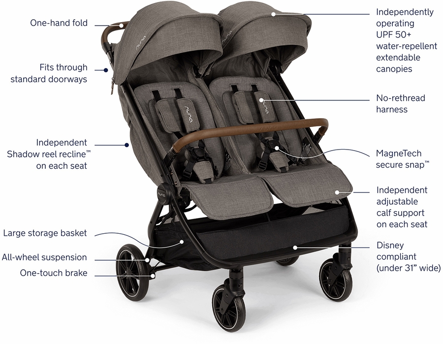 - Seats and canopies are completely independent of one another for customized strolls for two