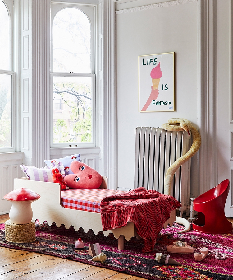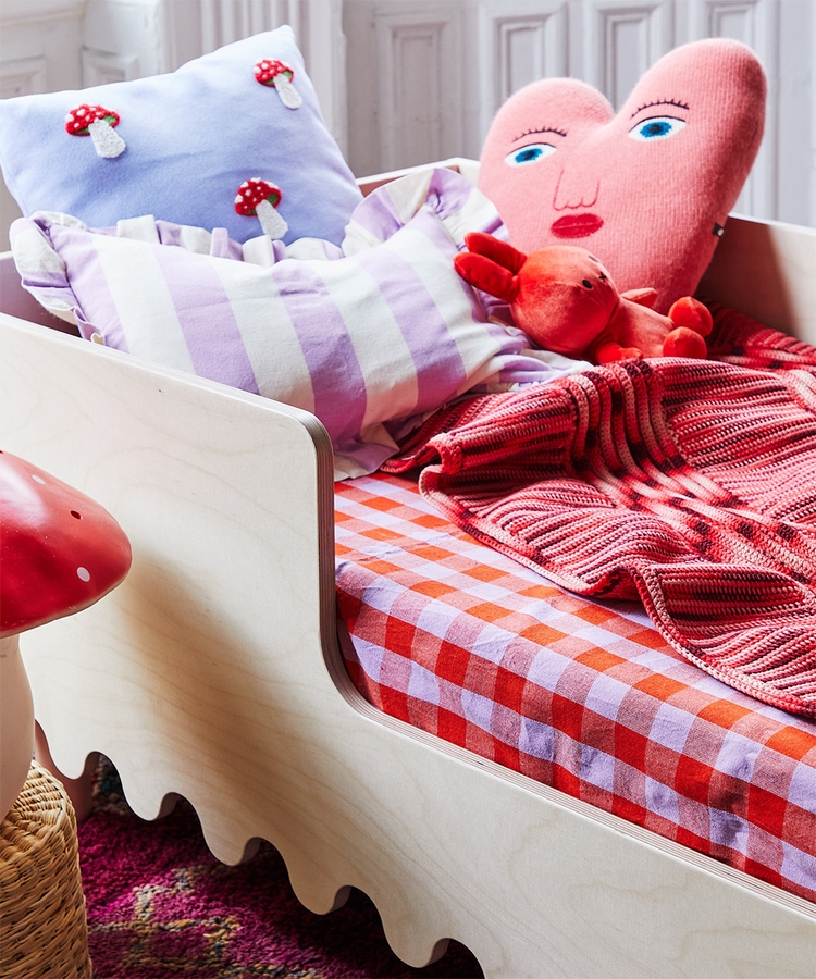 Want to celebrate the milestone of moving to a “big kid bed” with a stand-alone toddler bed? The Oeuf Moss Toddler Bed features a bold-yet-simple wave motif that’s an instant statement in any room. It uses a standard crib mattress and sleeps comfortably for children up to age 6.