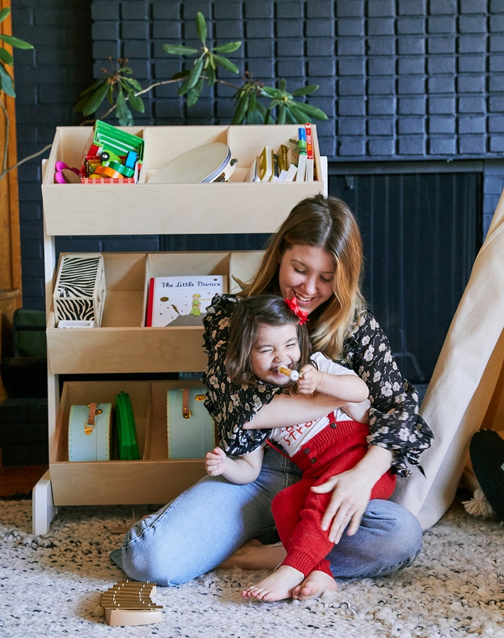The Toy Store is an innovative storage system designed to make organization as easy as 1, 2, 3. The three tiers of storage bins are ideal for books and toys. With the option for the bins to be positioned flat or tilted, the resulting easy access makes clean-up a breeze. Even the kids will want to pitch in and help! The bin dividers are removable so you can store a multitude of items of varying sizes ? from the smallest Lego to oversized puzzles and everything in between. Available in birch and walnut finishes, with a white frame.