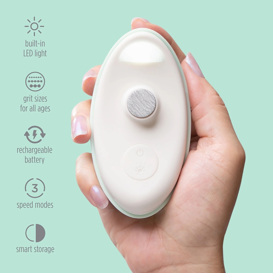 The Olababy rechargeable nail trimmer features gentle rotating filing pads, preventing potential damage to surrounding skin, cuticles, and nail beds.