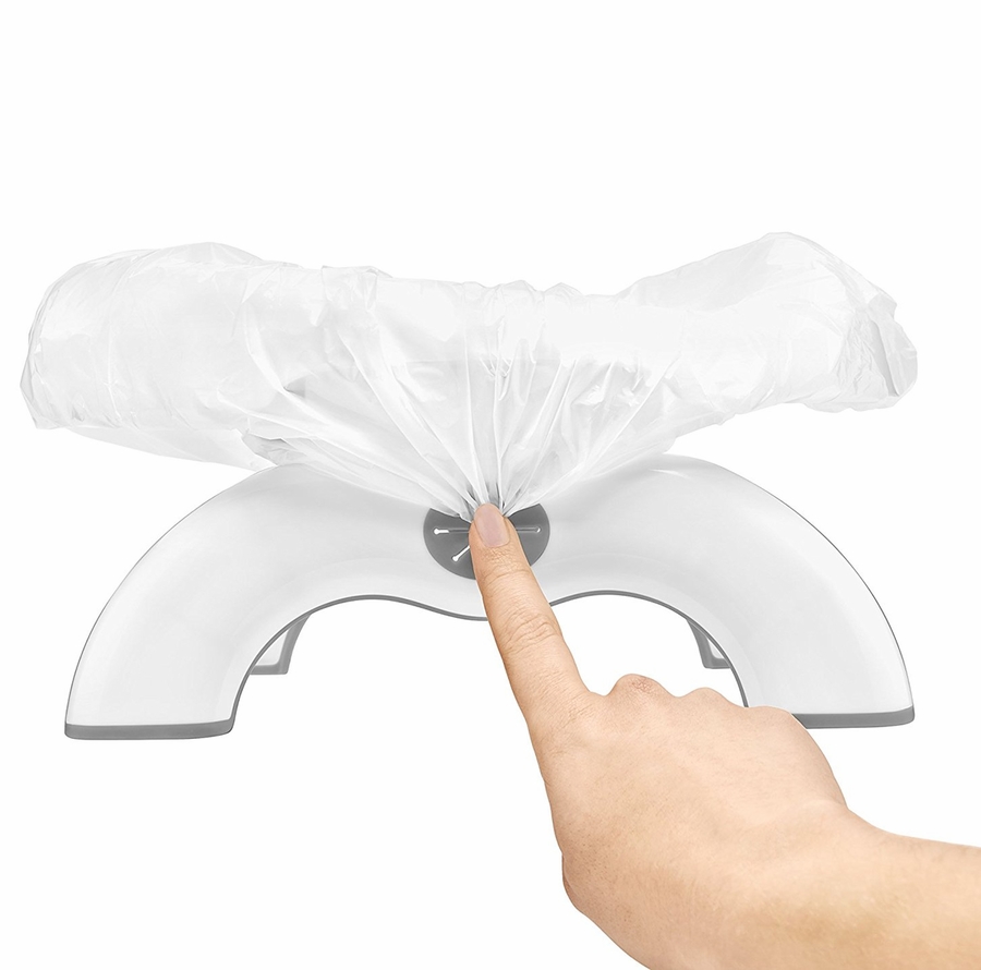 Always be prepared for on-the-go potty emergencies with the OXO Tot 2-in-1 go potty. The 2-in-1 go potty opens quickly and easily so it can be ready in snap, whether you need a standalone potty to use with disposable bags, or a potty seat to use on a grown-up toilet. When using the 2-in-1 go potty as a stand-alone potty, the legs lock securely in place at the ideal height for growing tots, and the soft, flexible flaps hold the disposable bags securely in place. Three disposable bags with absorbent pads are included, and refills are available, but the Potty was designed to accommodate standard plastic bags in a pinch. For use as a potty seat on grown-up toilets, the legs of the 2-in-1 go potty fold all the way out and non-slip grips keep the Potty stable on round or elongated toilets. The small seat is sized perfectly for little bottoms and the generous shield prevents splatter. The smooth surfaces of the potty are easy to clean, and the legs fold in to fit the Potty in the included Travel Bag for compact storage in cars, strollers or diaper bags.