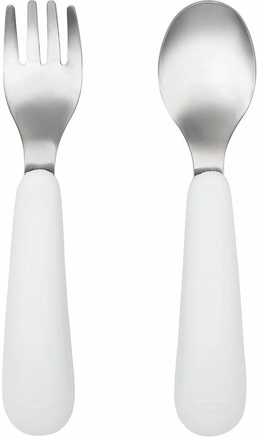Both Fork and Spoon make it easy for young eaters to get their food from dish to mouth. A flat spot on the handles prevents the fork and spoon from rolling off the table or high chair tray, and the soft grips are shaped to keep them from sliding into bowls or plates. Made of durable stainless steel.