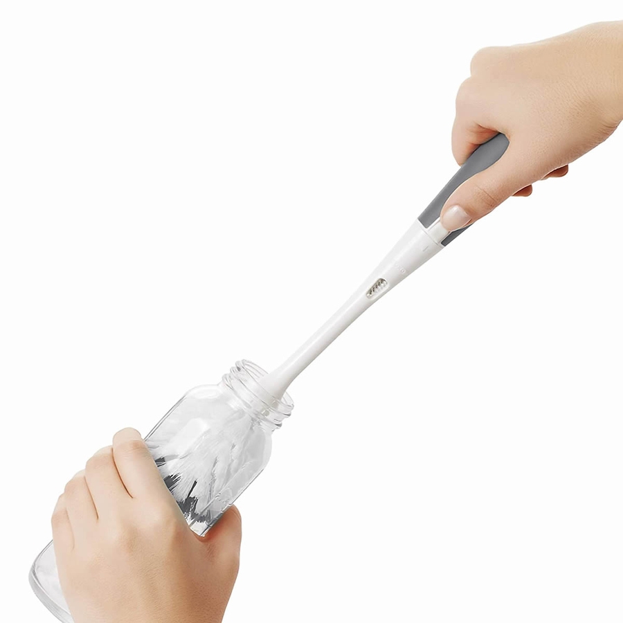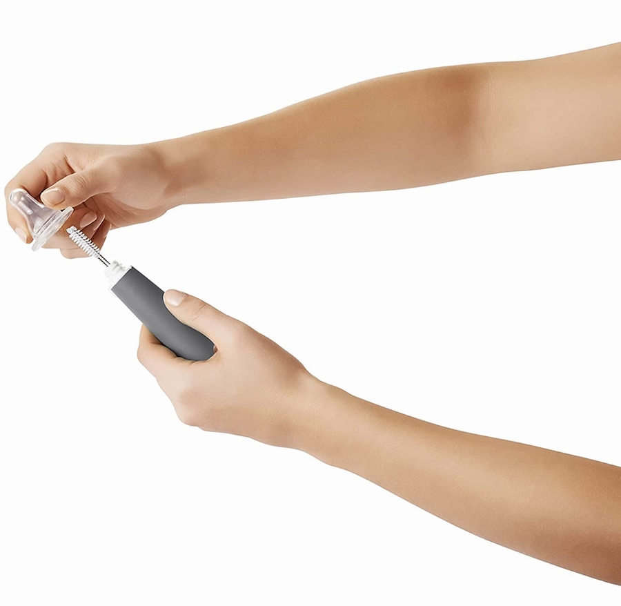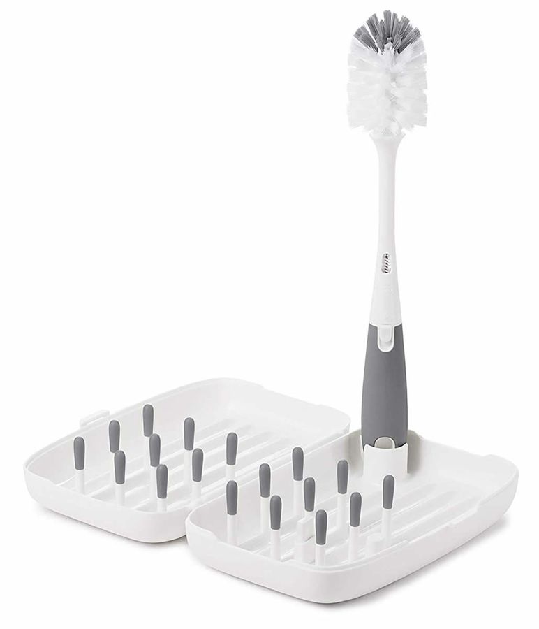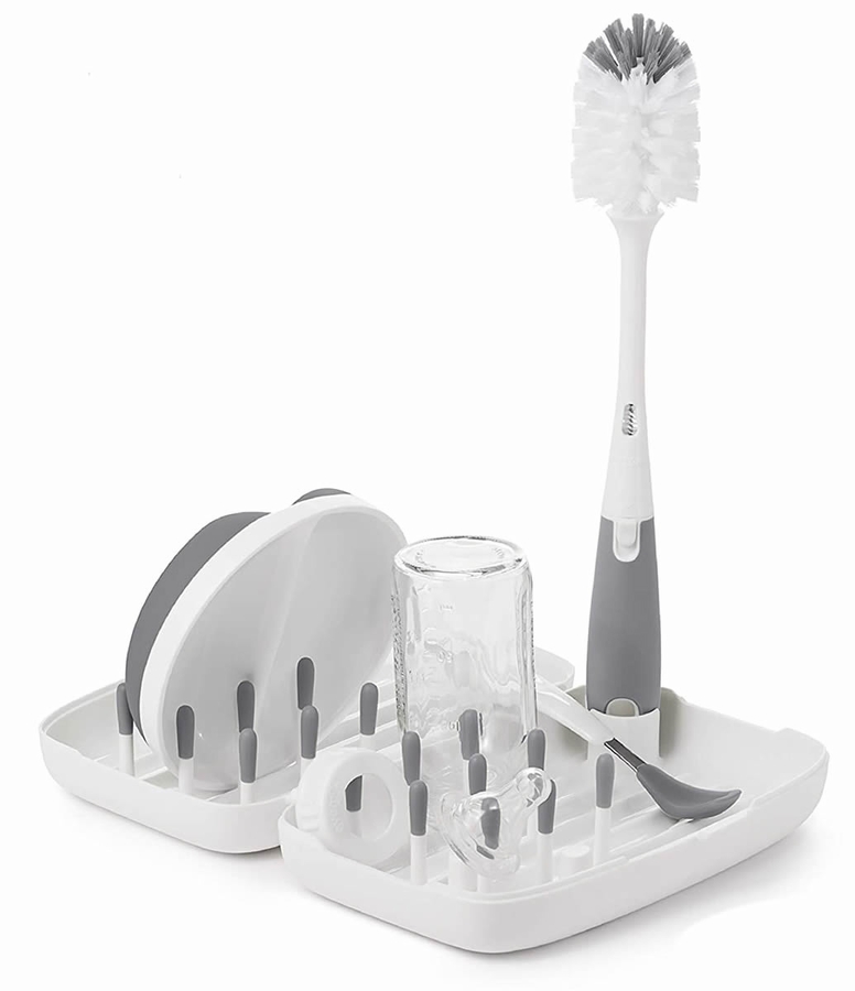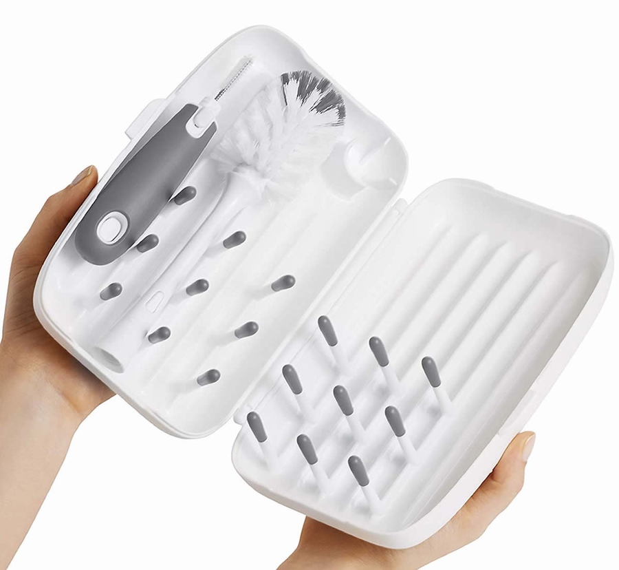 Make cleaning up away from home hassle-free with the OXO Tot On-the-Go Drying Rack with Bottle Brush. This compact cleaning kit is small enough to easily fit into diaper bags or purses while on the road. It opens into a drying rack with flexible tines that accommodate bottles, nipples, breast pump parts and more. Neatly tucked inside the folded drying rack are a silicone detail cleaner and bottle brush head that assemble to form a full-sized bottle brush. The brush has soft and firm bristles for gentle cleaning or serious scrubbing, plus a soft, non-slip handle. The silicone detail cleaner scrubs tight spots like bottle nipples and breast pump parts more effectively than bristles can. Ventilation holes provide aeration for quick drying, so you can say good-bye to wet brushes in inconvenient plastic bags.