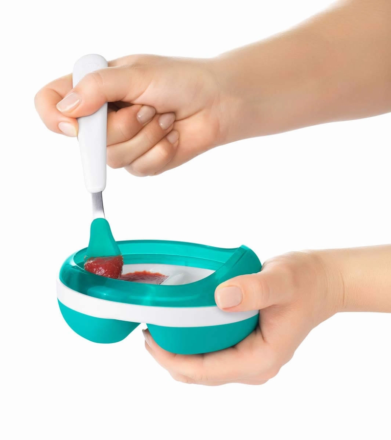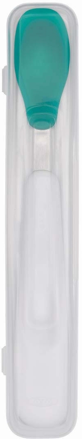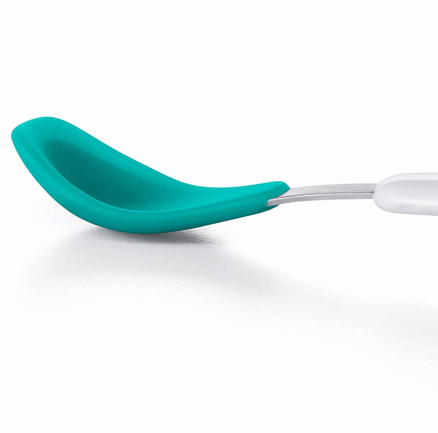 Food-grade silicone coating gives this Feeding Spoon a soft touch. Each shallow spoonful holds just enough for babyās mouth, and is soft enough to scrape the last bits out of the bowl or wipe them off of babyās face. Spoon fits neatly into the compact carrying case.