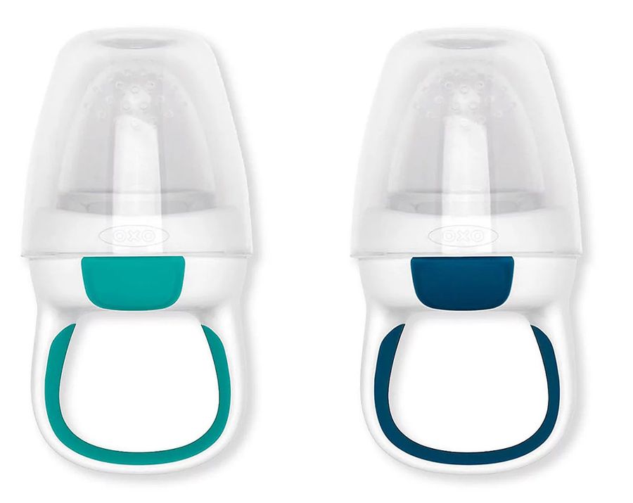 The OXO Tot Self-Feeder features a large pouch that sieves out food bits to promote safe self-feeding for your little one. Its strawberry-shaped silicone pouch fits comfortably in your baby's mouth and the soft-grip handle is sized for little hands.