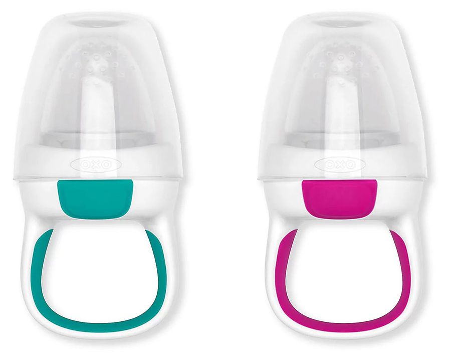 The OXO Tot Self-Feeder features a large pouch that sieves out food bits to promote safe self-feeding for your little one. Its strawberry-shaped silicone pouch fits comfortably in your baby's mouth and the soft-grip handle is sized for little hands.