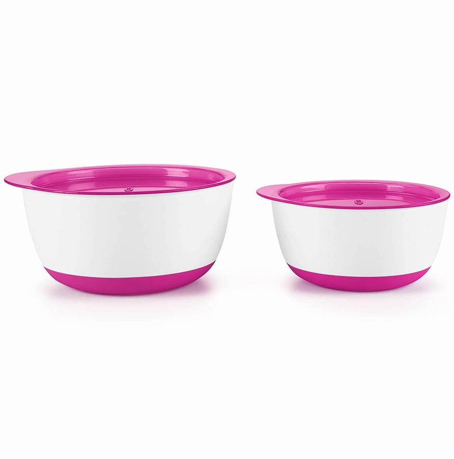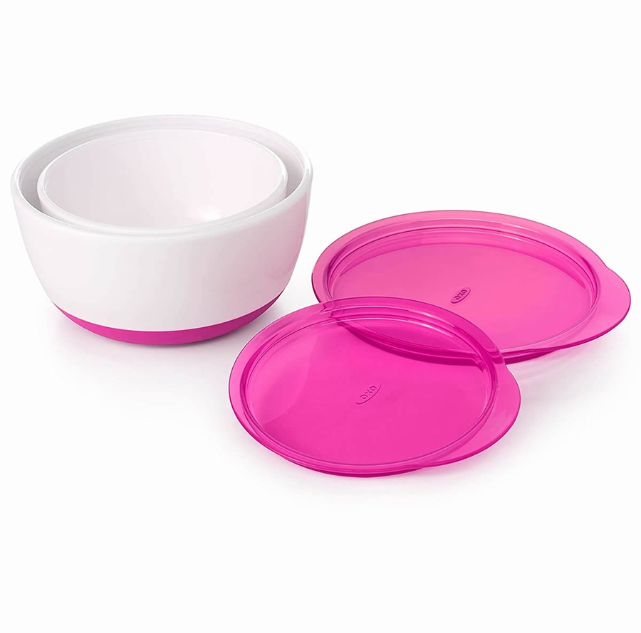 Our Tot Bowls come with snap-on lids for food storage and portability. The straight side walls make it easier for little ones to guide their food onto utensils. Stable, non-slip bases help prevent tips and spills at the table. Bowls nest for compact storage.