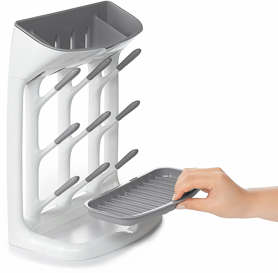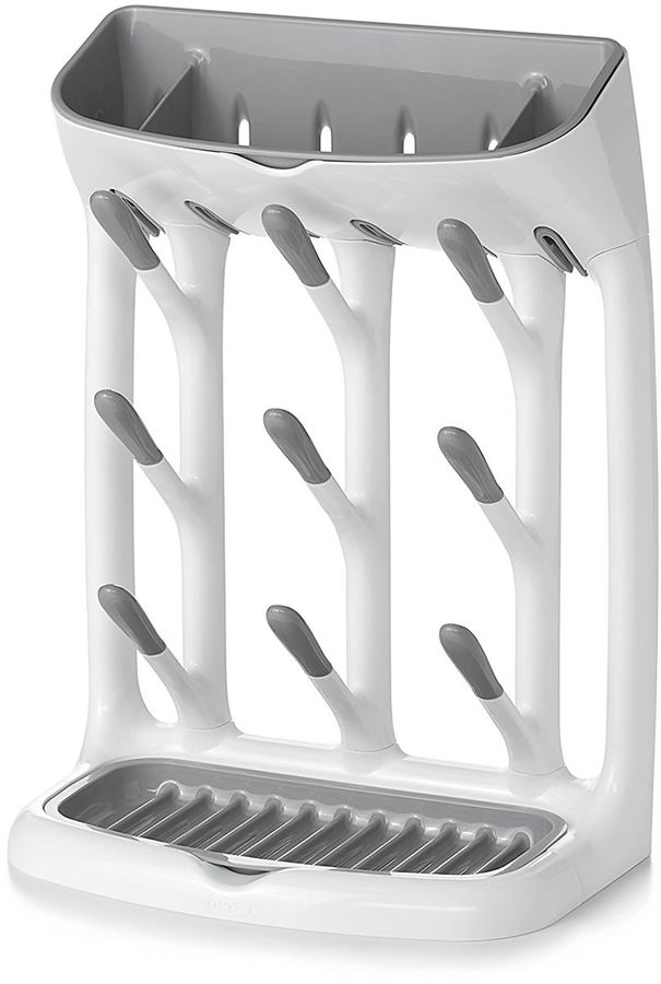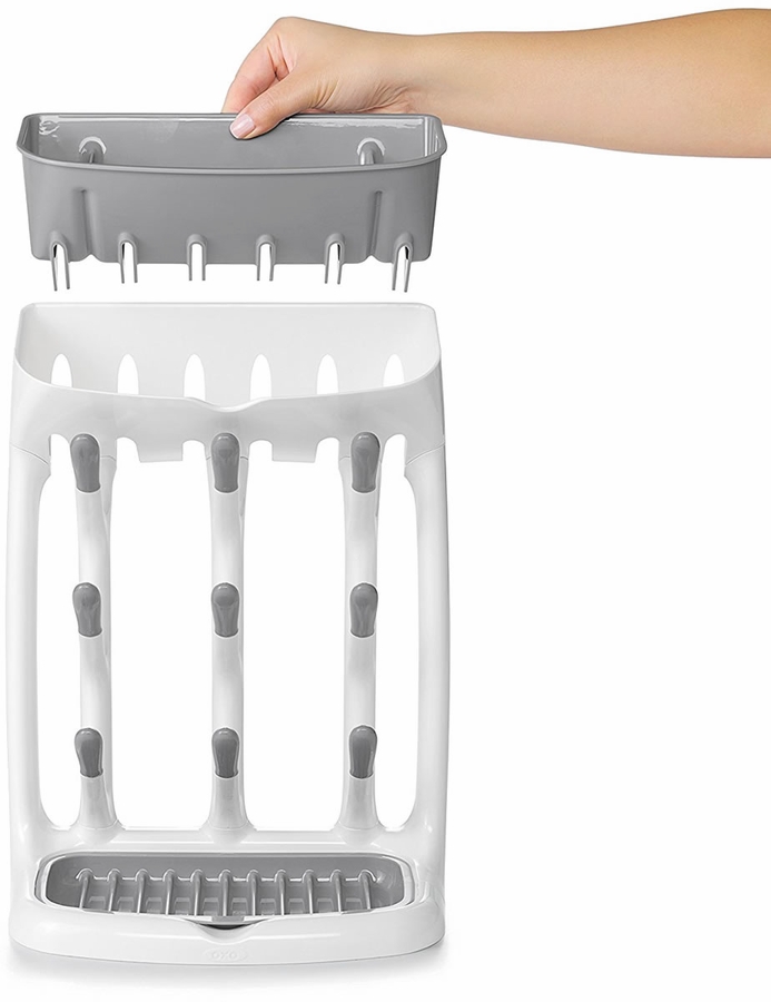 With a compact design that makes a big impact, the Space Saving Drying Rack will hold cups, bottles, and all their parts without cluttering the countertop. The angled pegs hold cups and bottles at just the right angle for thorough drying, while the top and base are perfect for drying small parts like valves, or even pacifiers. The Drying Rack fits neatly under cabinets, so it can be tucked out of the way against the wall. The base tray features ridges to keep lids and more elevated for quick drying, and both the base and top trays are removable for thorough cleaning.