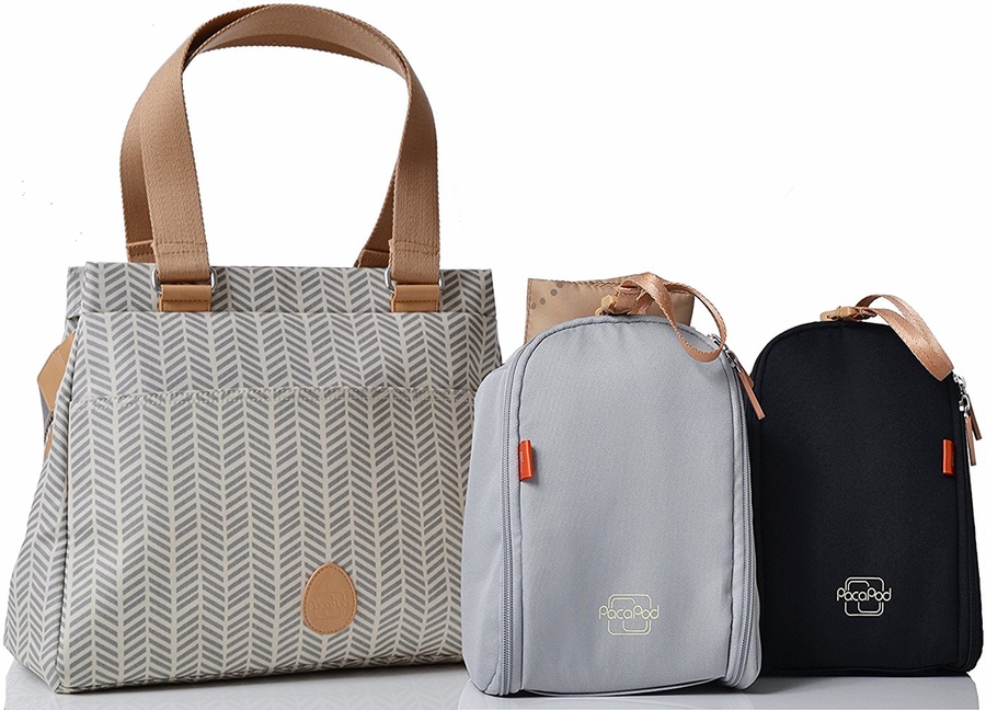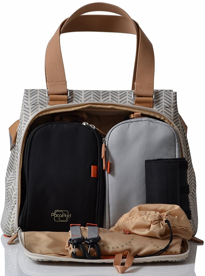 Richmond is an effortlessly clean and streamlined classic tote bag. Tucked discretely inside the rear cargo section of the bag you’ll find clever 3 in 1 baby organization system with a feeder pod (cool bag) a changer pod, padded changing mat and insulated bottle cover. Available in a subtle neutral color palette of plain slate or chic charcoal print with vegan leather trims and an embossed PacaPod egg for the finishing touch. The Richmond is durable and made in a coated cotton canvas fabric that is wipe clean, while the thick webbing carry handle and strap make it versatile and comfortable to carry over the shoulder, across the body, or it can be clipped onto a buggy to go hands-free.