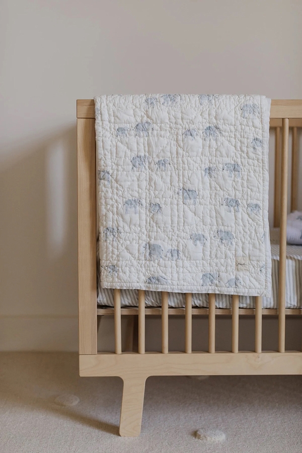 In the softest palette and quilted organic cotton comes our Follow Me Elephant Blanket. Telling the story of the intrinsic and unmistakable love and bond between parent and child, delicate watercolors are carefully layered for an enchanting and lifelike effect. Made with 100% organic cotton and handscreen printed by our Artisan Partners, it’s sure to become a nursery blanket you'll treasure forever.