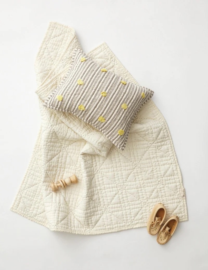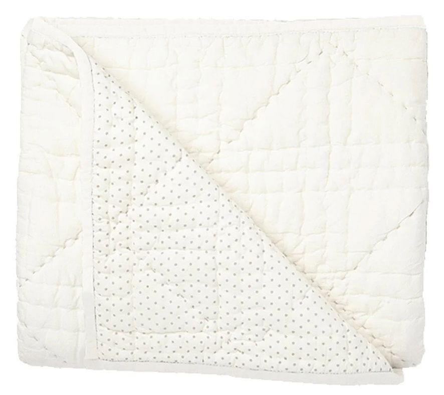 Baby's first must have nursery accessory in three baby perfect colors, pink, blue and grey, to keep them warm and cozy, or give them a soft place to nestle. This Stork Blanket is 100% quilted cotton front with a stitch detail, screen printed grey pin dot reverse.