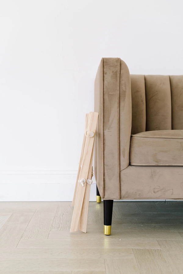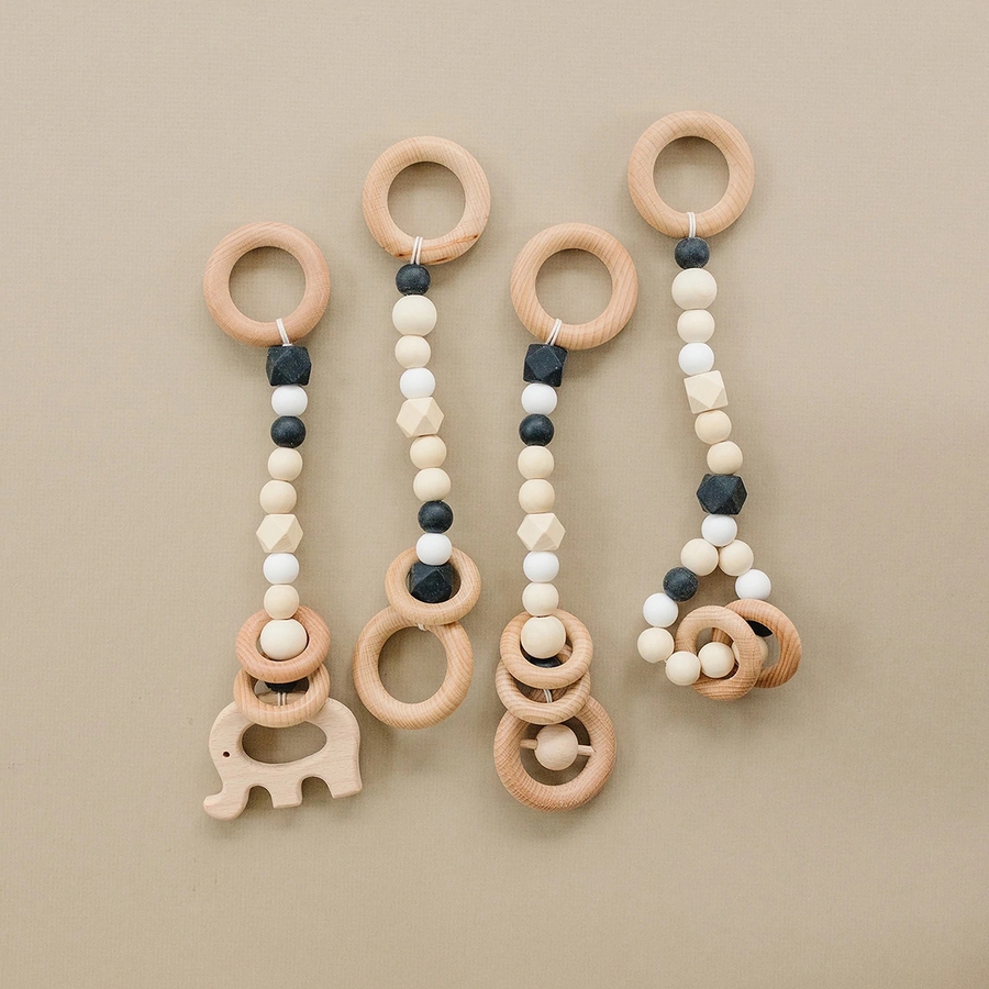 Our wooden baby gyms are made of smooth, sanded wood. They ship unassembled with wood legs, hanging dowel, two ropes, and two wooden knobs. No tools required for assembly.