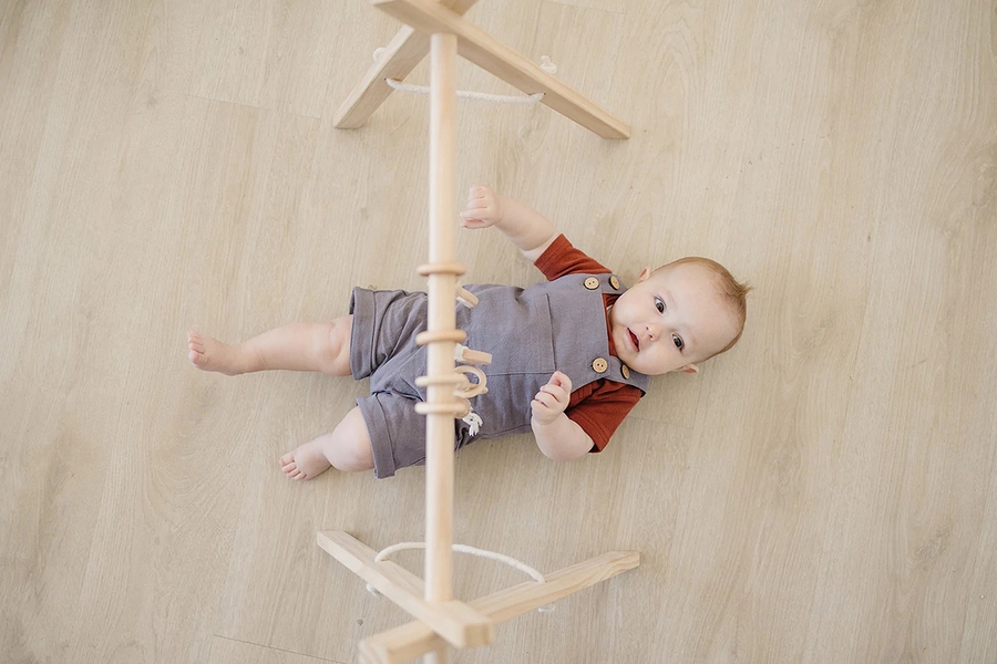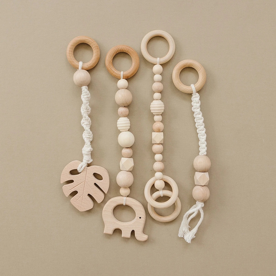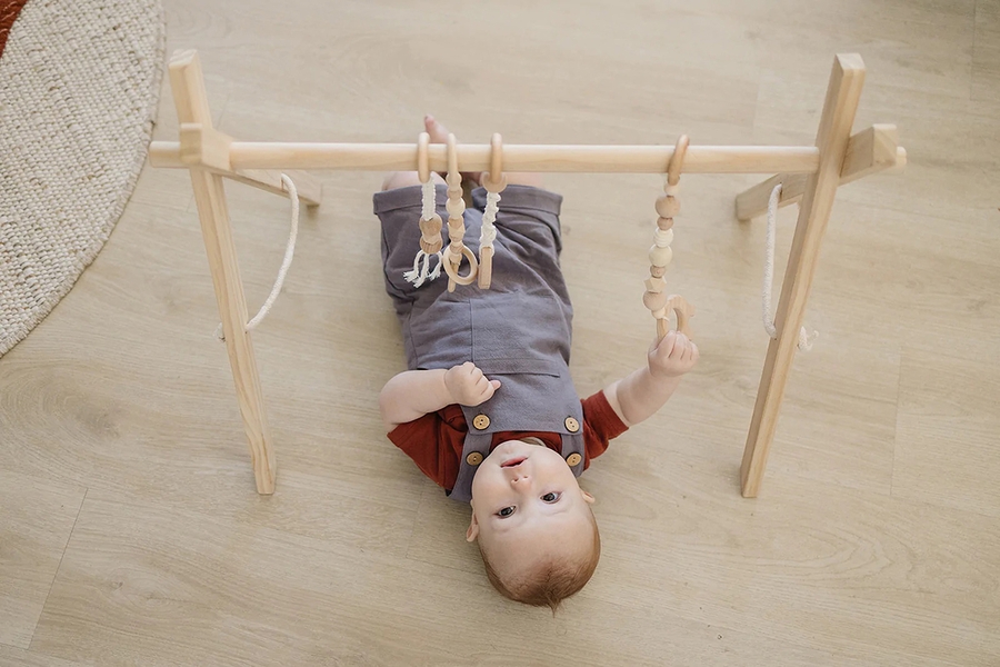 Our wooden baby gyms are made of smooth, sanded wood. They ship unassembled with wood legs, hanging dowel, two ropes, and two wooden knobs. No tools required for assembly.