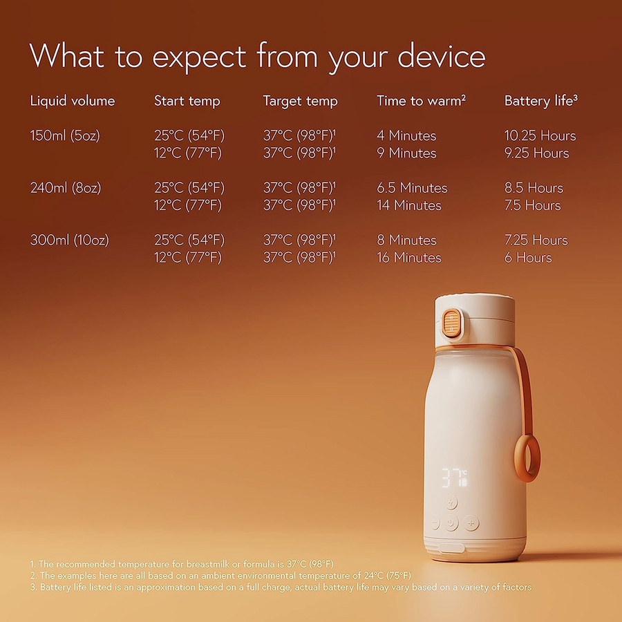 BuubiBottle is the perfect bottle warmer for breast milk, formula, water, and more. Its intuitive design makes it fast warming, extremely secure, and highly portable, giving you a portable formula warmer. Featuring USB Type C charging and a large-capacity battery, BuubiBottle can keep fluids warm for up to 10 hours* on a single charge.