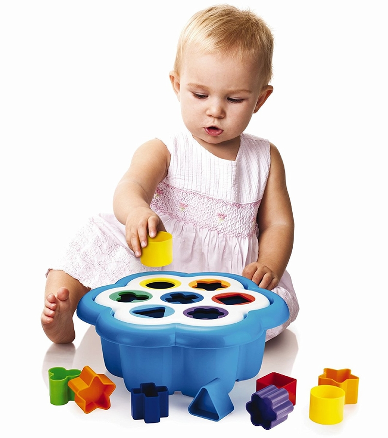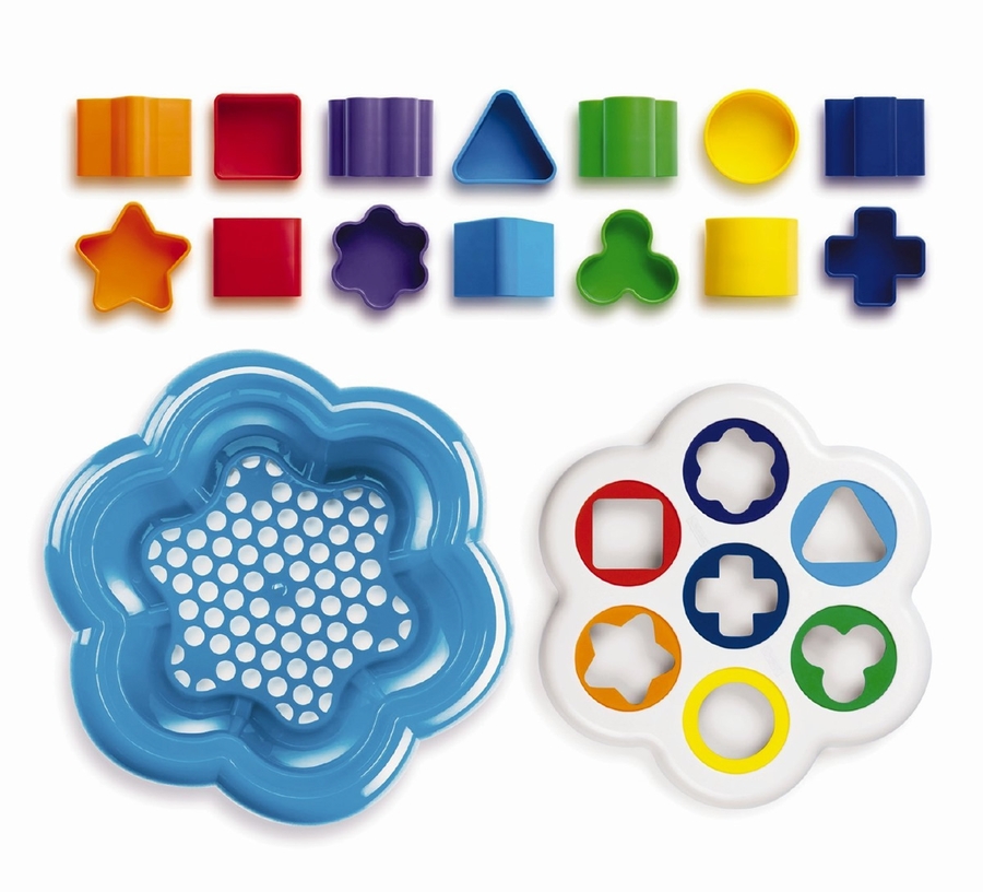 A timeless favorite: this is the classic "shape sorter toy" featuring a daisy-shaped base with seven holes in different sizes and bright colors. Each hole corresponds to a block that your little one will learn to recognize and drop into the right hole. Each shape is coordinated with a different color so that children can easily find the matching pieces and sort them by shape and color, strengthening their hand-eye coordination, as well as their early motor skills and dexterity. The daisy shaped board turns into a practical lid for the capacious bucket where all 14 pieces can be conveniently stored. It is a fun surprise for children to lift the lid and see all the blocks reappear, ready to start over again for endless and totally safe play!