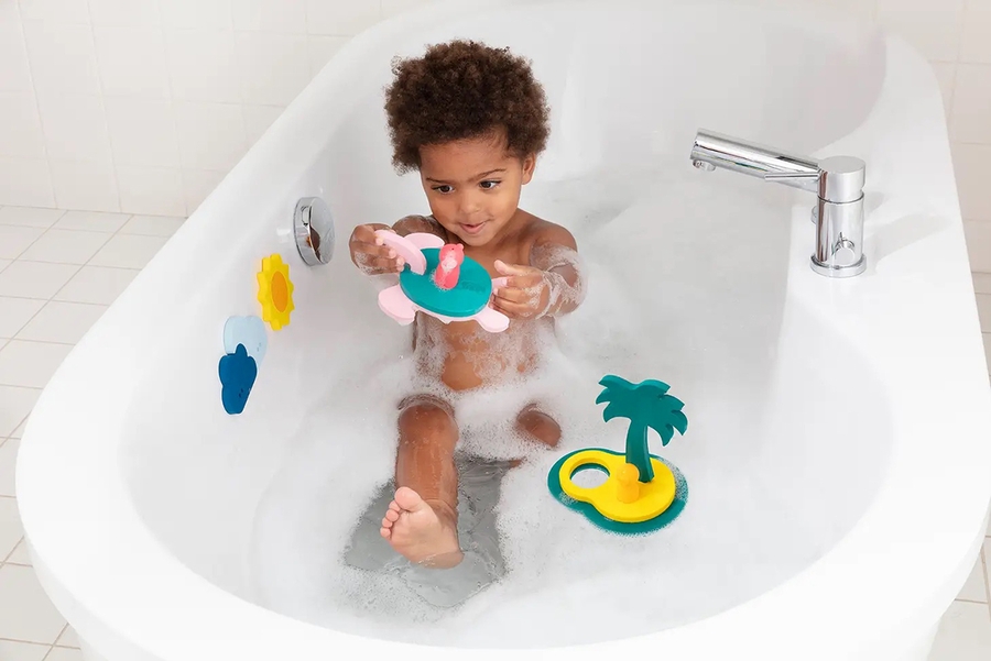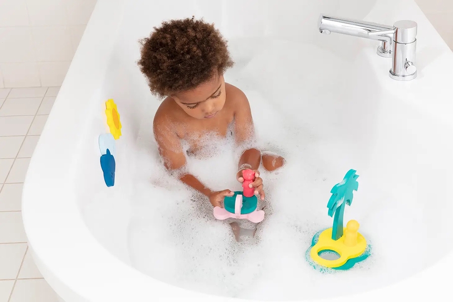Assembling the various shapes helps improve children’s fine motor skills and simulates their creativity and imagination. All the shapes are made of soft foam, so they stay afloat. This set also contains 2 finger puppets made from sustainable plastic.