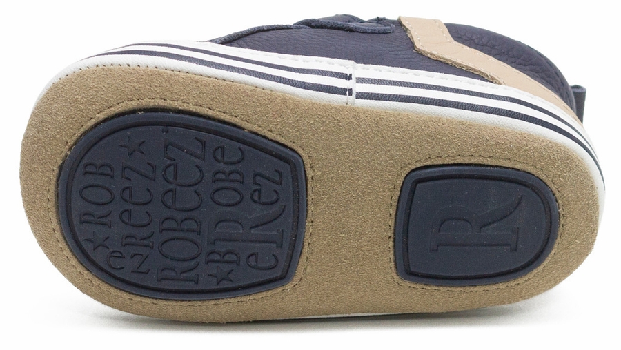 The Adam First Kicks in Blue Leather give budding walkers an incredibly cool sneaker style to wear, just like the adults. The blue leather sneaker resembles a pair of high-tops parents sport from day to day and is outfitted with a geometric tan suede detail, hook and loop strap, and faux laces. The split rubber sole below grips the floor and helps prevent unnecessary slips and spills.