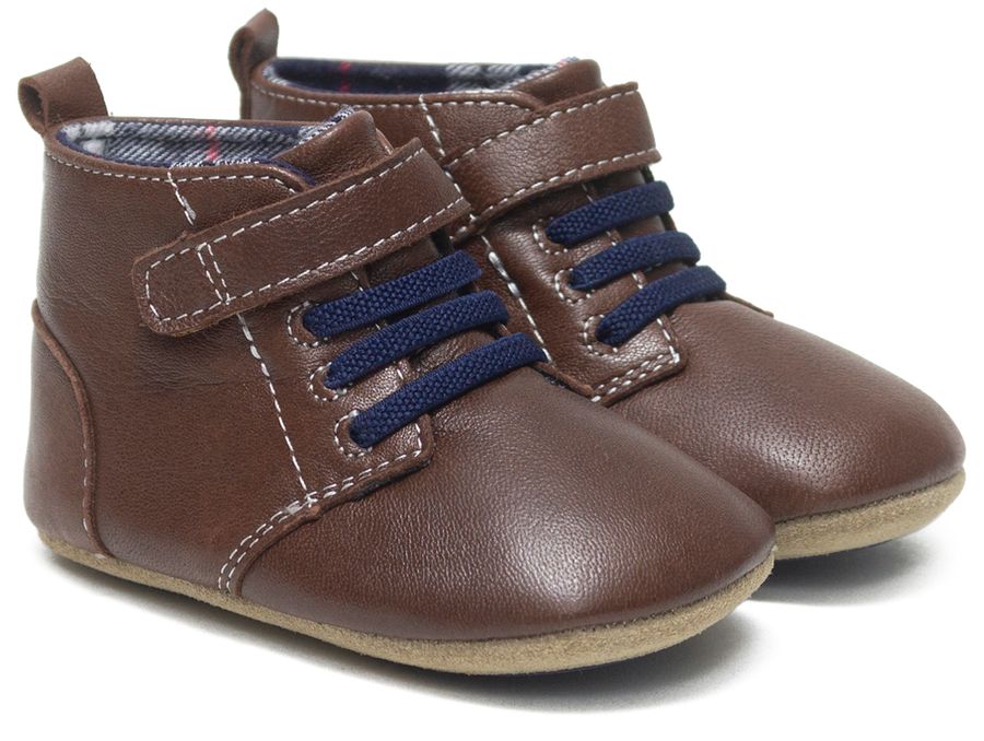 The Thiago First Kicks in Rust are introduced just in time for the colder months. Perfect for beginner walkers, Thiago is a classic brown leather baby shoe made with stretchy, faux laces, a velcro strap closure, and split rubber sole. In a nutshell, our Thiago is designed to stay on your baby's feet and assist in gripping the floor as walking becomes more the norm. The plaid lining adds a touch of warmth, too.