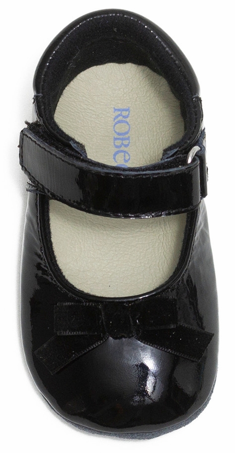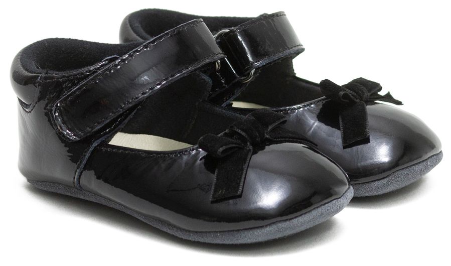 The Velvet Bow First Kicks in Black are this year's holiday go-to baby shoe. Perfect for dressing up, our spin on the Mary Jane is made of shiny, black patent leather with a hook and loop ankle strap and topped with a bow. The split rubber sole grips the floor and helps prevent slips and spills—so little walkers can stay on their toes all day long.