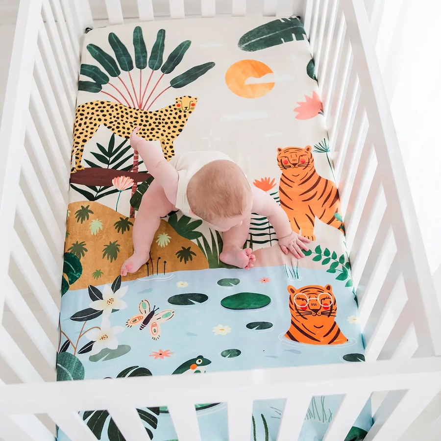 Our fitted crib sheet fits US standard crib mattresses 52 x 28 inches. Made with soft 100% cotton sateen, 230 thread count. OEKO-TEX® certified and crafted without harmful chemicals. Lab tested to last, compliant with US regulations. Premium printing method ensures colorful, sharp details that remain vibrant.