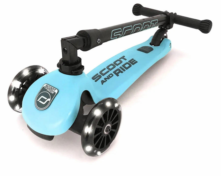Scoot & Ride HighwayKick 3 standing scooter will quickly become your child's favorite thing to ride. It ensures maximum stability by means of two front wheels and our safety pad as rollover protection. Our scooter has an adjustable and foldable handlebar for improved handling it also allows easy storage. The handlebar can be raised anywhere between 24-32 inches. No tools required for adjusting handlebar height or for folding it down, making it easy for anyone to adjust. All three wheels features white LED wheels to make your ride the coolest and flashiest on the street.