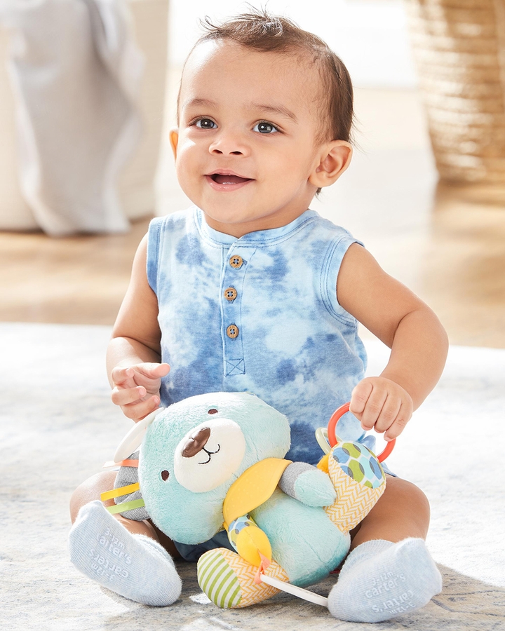 Perfect for multi-sensory play, this soft toy and teether in one features rattles, crinkle sounds and more for baby to explore. A soft bandana teether toy detaches for mom or dad to wear around the wrist for quick access. Great for at-home play or on the go.