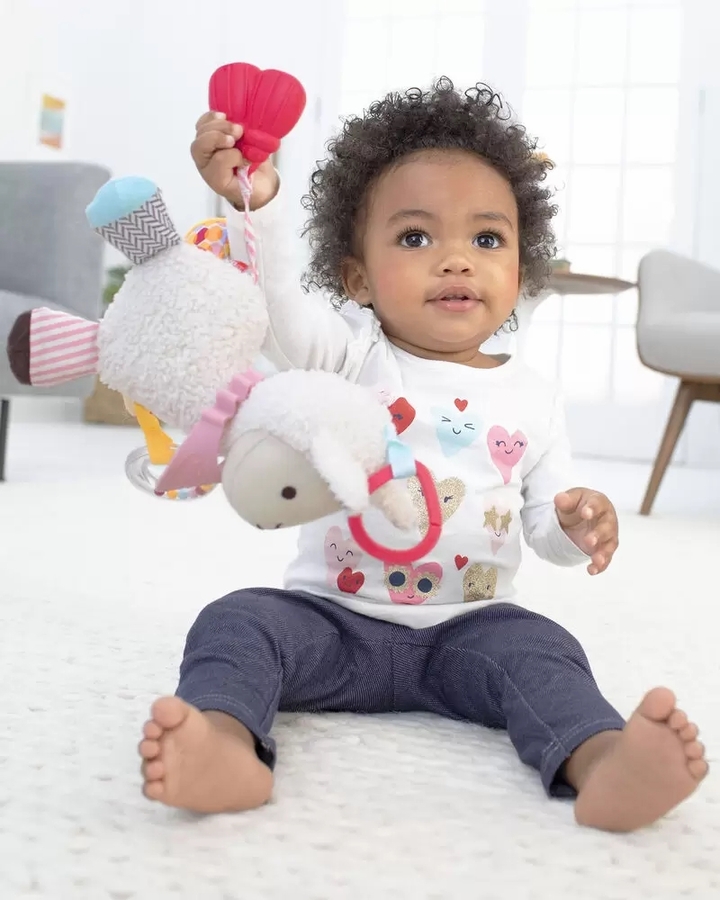 Perfect for multi-sensory play, this soft toy and teether in one features rattles, crinkle sounds and more for baby to explore. A soft bandana teether toy detaches for mom or dad to wear around the wrist for quick access.