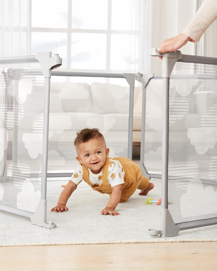 From crawling to first steps, when little ones are on the move, a baby-proof play area keeps them out of harm’s way—and gives parents peace of mind. Featuring six cloud-print mesh panels that allow visibility between parent and child, our décor-friendly play yard & baby fence keeps baby contained and in sight. Offering 20 square feet of standalone playspace, the six panels include a hinged door with a secure closure. The airy, yet sturdy, steel-frame panels also work together as a room divider with secure wall mounts (included) anywhere you choose.