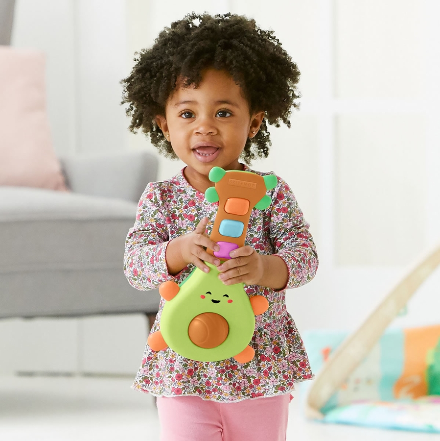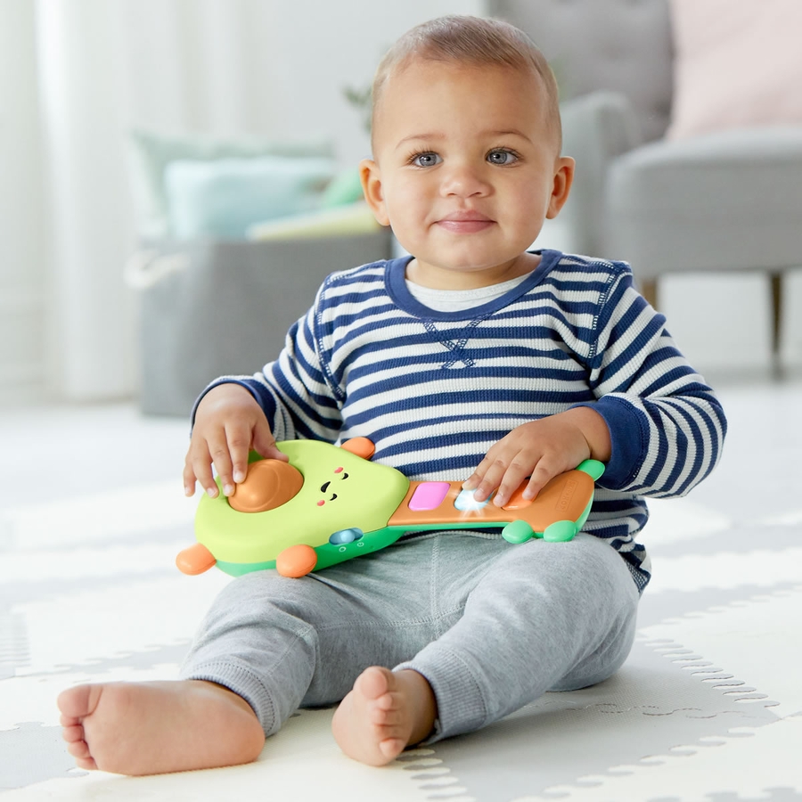 This is the best, funniest toy we have for our little one. He loves playing with it, and it is clearly his favorite toy in the toy box. We as parents also love it, because it is very funny to watch him play it, and the songs it plays are actually really good. It's like watching a little old man play old folk and blues songs on an avocado. It's hilarious!