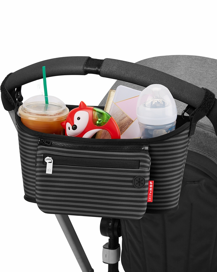 This insulated beverage and essentials caddy stretches to hold bottles and coffee cups securely, while providing easy access to your most important items. Fitting most stroller bars and handles, this organizer bag includes a detachable wristlet for errands and a headphone port for hands-free calls.