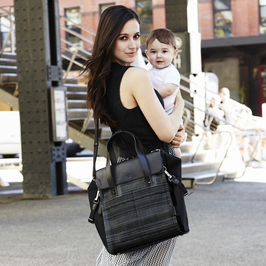 Welcoming a new baby gives you the chance to revamp your closet ? and a new bag is the easiest place to start. The Highline by Skip Hop collection has reinvented the diaper bag for women who refuse to compromise personal style and much-needed function. Our Convertible Diaper bag is an instant conversation piece. A statement silhouette that can be worn as a Crossbody, converted to a Backpack, or carried by its Tote handles, the Convertible Diaper Bag is everything you need and the ultimate find. But there’s more: gorgeous 100% Napa leather details, contemporary patterns, one-handed stroller clips, a hidden bottle pocket ? there’s a place and reason for everything. No one will know it’s a diaper bag and your other mommy-friends will want one once they figure it out.