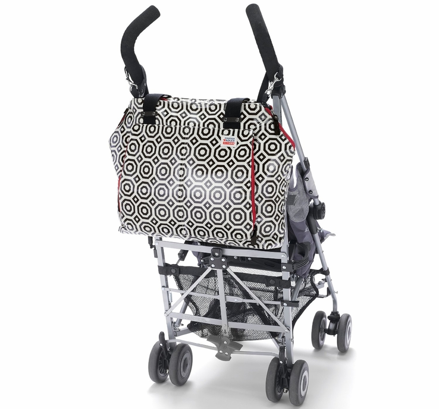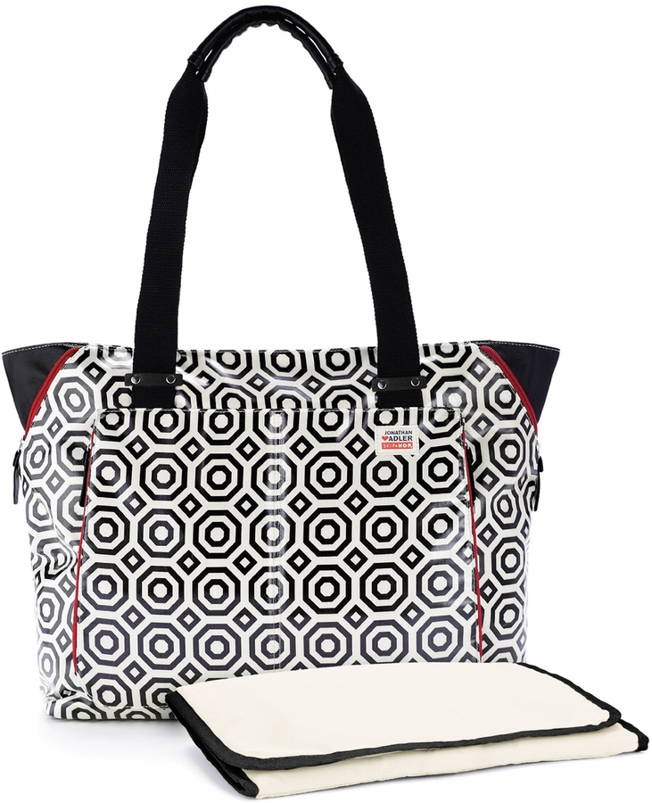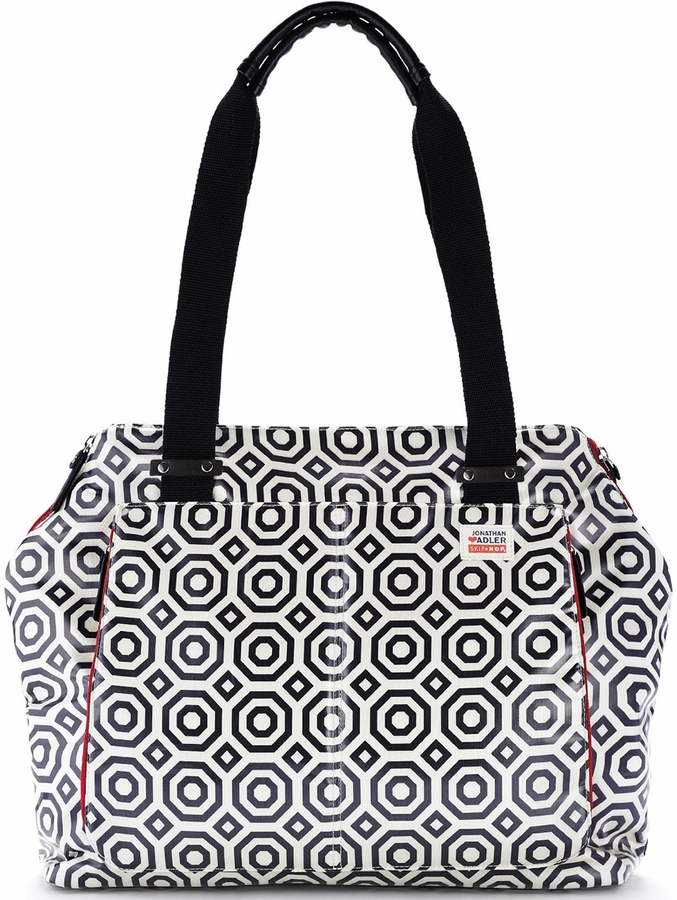 This chic lightweight tote is a diaper bag in disguise. Designer Jonathan Adler and Skip Hop have collaborated to bring you a bag that’s both functional and fabulous. It’s the perfect carry-all with plenty of room for mom’s and baby’s stuff. It features a front pocket that doubles as an insulated bottle compartment and two top zippers that allow you to modify the silhouette, changing the look from tote to handbag.