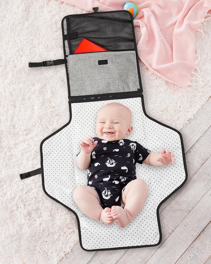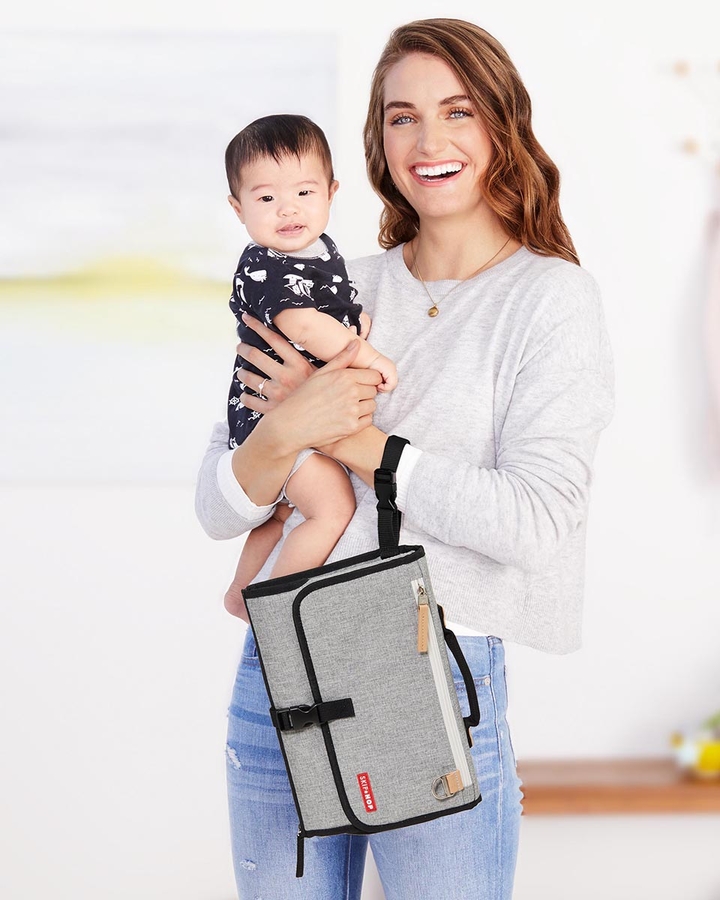 Its extra-wide changing pad wipes clean, and the head area is cushioned with an innovative "pronto pillow." The pad is also removable, allowing the body to become an independent diaper carry-all. The Pronto also includes a translucent wipes case, a mesh pocket that fits up to four large diapers and ointments, and a front zipper pocket for personal items.