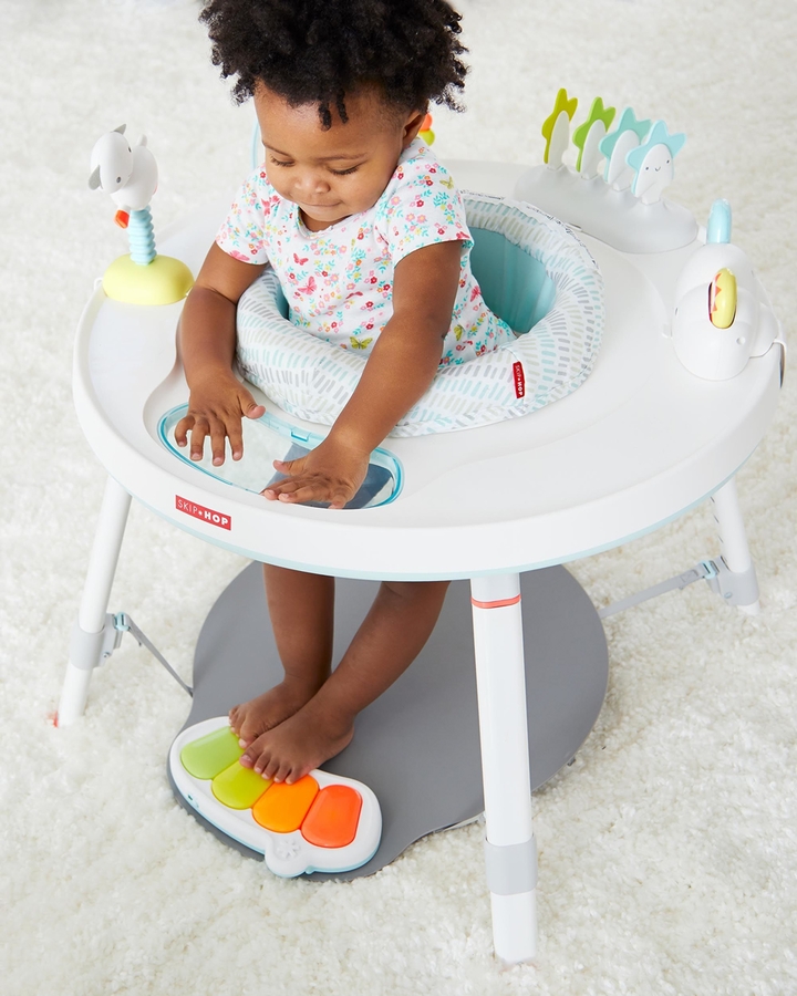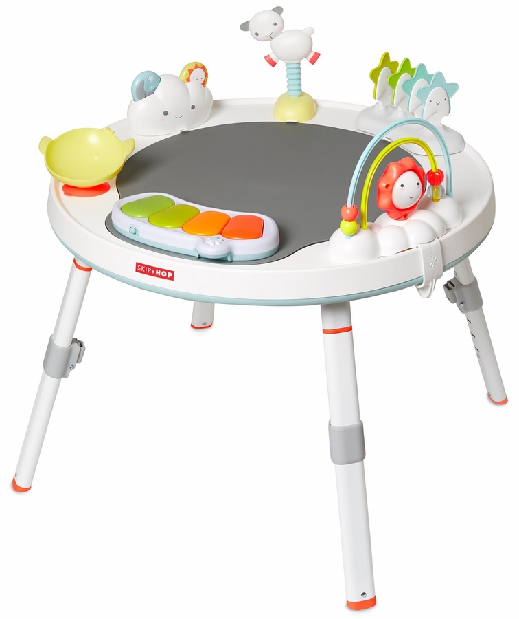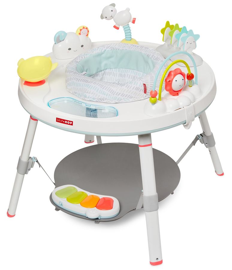 Designed to grow with baby in three stages, Skip Hop's Silver Lining Cloud Baby's View Activity Center is an action-packed take on our best-selling gym. Feauturing the same developmental approach to play and learning as our Explore & More? version, the d?cor-friendly design features a 360-degree rotating seat that turns and stretches for bouncing. Our unique Discovery Window gives little ones a clear view of their feet as they play the light-up piano to connect cause and effect. Four dreamy toys can be rearranged for customized play. As baby grows, the activity center converts for easy cruising. At stage three, it transforms into a sturdy toddler table with a plastic chalkboard surface for drawing, playing?the sky's the limit!