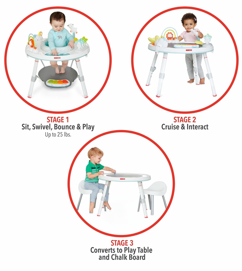 Three stages of use: Sit, swivel, bounce & play; Cruise & interact; Play table