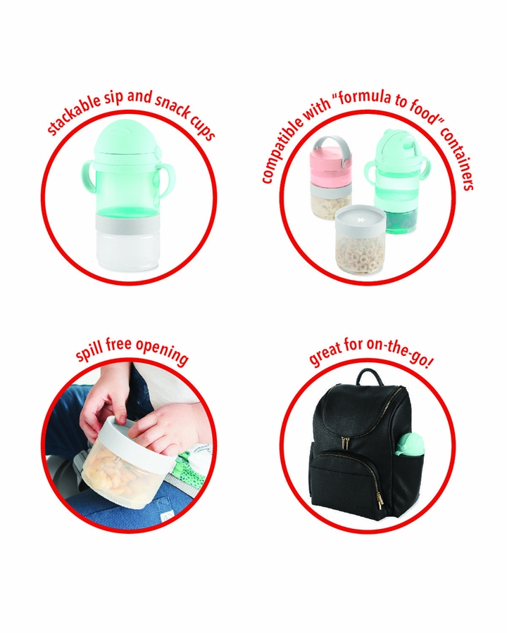 Designed to stack and customize for your needs, this convenient 5-piece mealtime set for baby and toddlers is all about options for sipping and snacking—at home and on the go. With two interchangeable twist-and-lock lids, two containers, and an optional handle, this easy-to-pack set lets you use components separately or stacked together. Fill with cereal, water, juice and more of your little one’s faves and you’re good to go.