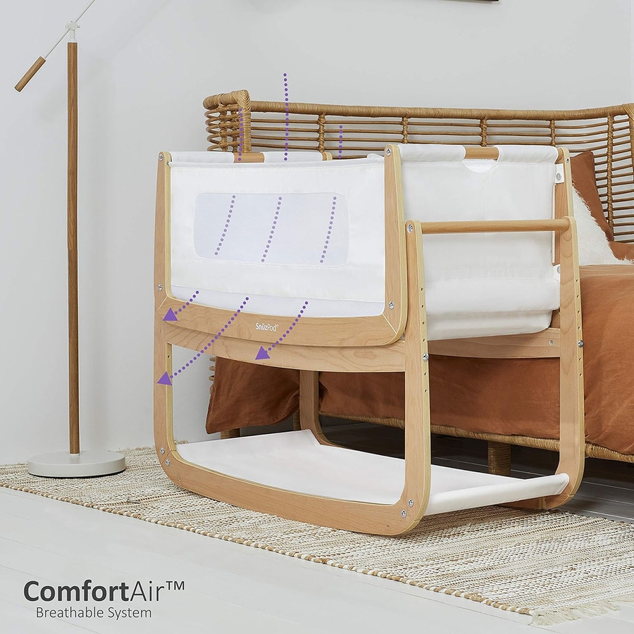 SnüzPod_ transforms nightly routines into cherished moments, bringing parents closer to their little ones. Designed in the UK and customized for the USA market, its soft curves and sleek lines embody a Scandi-modern aesthetic that is as welcoming as it is stylish. Safety is paramount, as the SnüzPod_ holds JMPA certification and adheres to the latest safety standards, crafted from sustainably sourced wood for lasting, dependable quality. With the innovative ComfortAir system, complete with air-flow vents and base ventilation, this bassinet ensures optimal temperature regulation for a restful night's sleep.