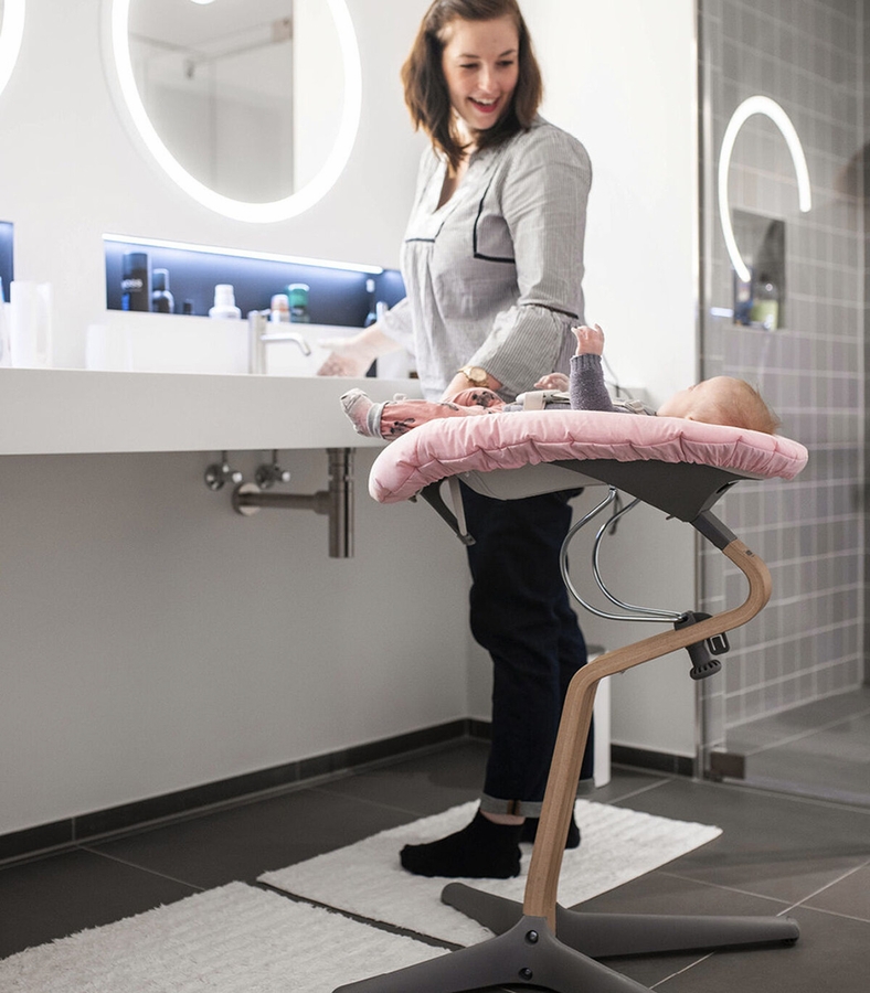 The Stokke® Nomi® Newborn Set is designed to provide your baby with a soft and cozy spot at the center of the family. The raised height is ideal for "talking", playing and maintaining contact with your baby. _ The Stokke® Nomi® chair with the attached Newborn Set is easy to move around the house. Wherever you need an extra pair of hands - it can be seamlessly adjusted between an almost horizontal and more upright positions to meet your baby's changing needs. It offers a gentle bounce responding to your baby's natural movement while your baby's head remains stable.