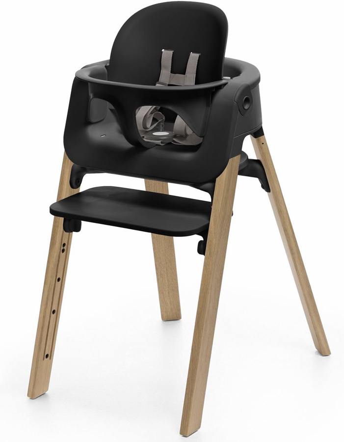 With the simple addition of Stokke? Steps? Baby Set, the Stokke? Steps? Chair transforms into a highchair which can be used from about 6 months. Safe and secure, the ergonomically designed Baby Set ensures that your baby is seated correctly. The back plate is adjustable in both height and depth to ensure a perfect custom fit as your child grows. The Stokke? Steps? Baby Set mounts easily onto the Stokke? Steps? Chair, tool-free.