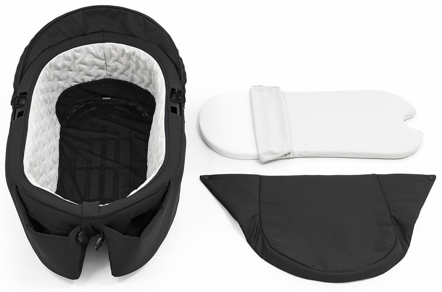 Protective & practical - the carry cot gives your newborn a cozy place to lie flat for rest and sleep during your outings together. The carry handle is covered with durable leatherette and doubles as a seat rail. Please note the carry handle comes with your stroller´s seat and can be used with the carry cot. The hinged carry handle provides easy access to your baby and makes the carry cot easy to carry. _ _Two roomy, well-placed pockets provide ample storage to keep mommy must-haves at hand, while quick-release buttons make the carry cot simple to detach from the stroller chassis. Also included is a breathable carry cot mattress. Made with Sorona® Bicomponent Stretch fiber.