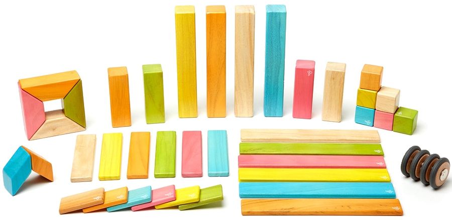 - Includes 42 blocks in 9 shapes: 4 tall columns, 4 medium columns, 6 mega planks, 6 long planks, 6 short planks, 6 cubes, 2 parallelograms, 4 short angles and 4 wheels