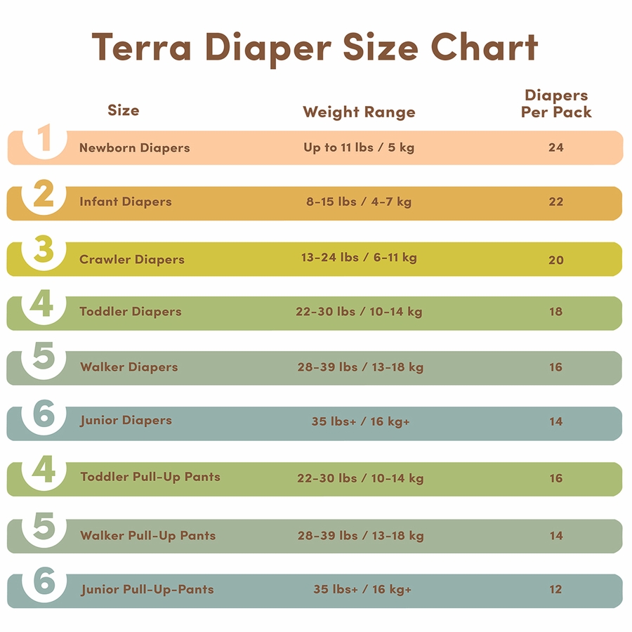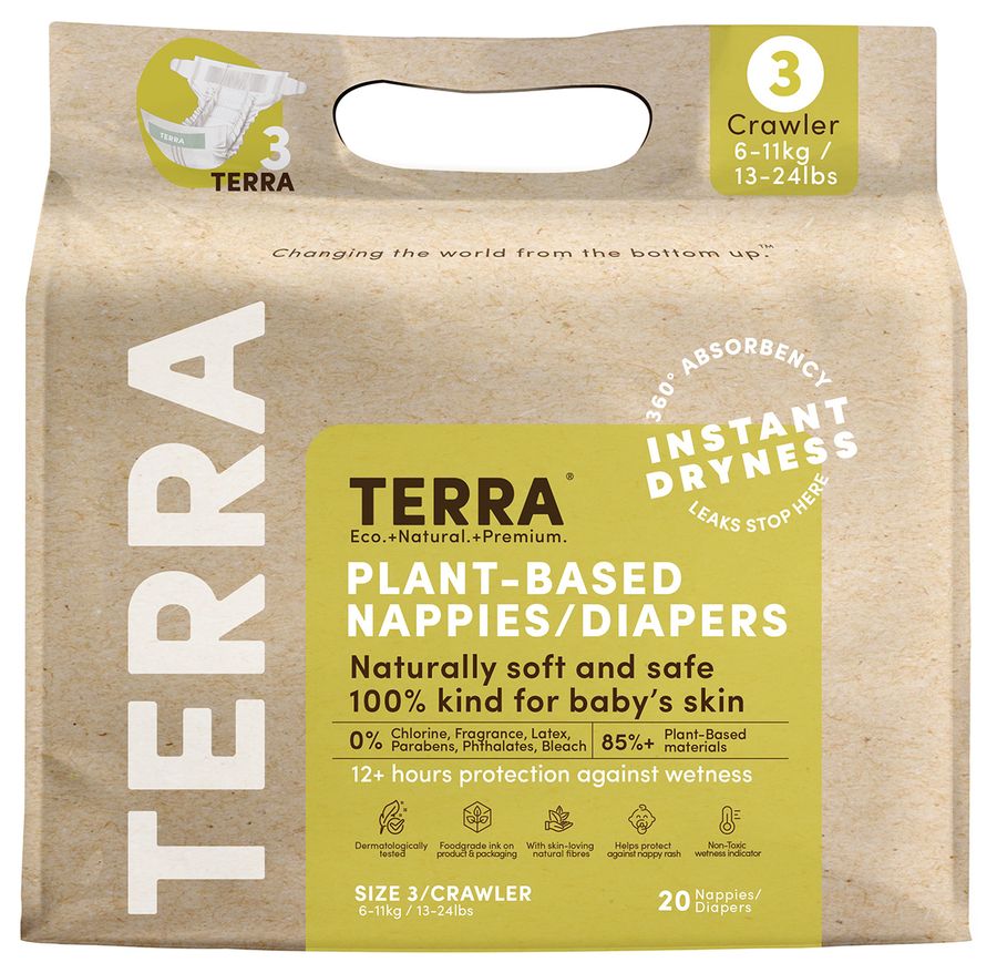When your little one starts crawling Terra 85% Plant-Based Diapers are right there with them to protect them from leaks and wetness.