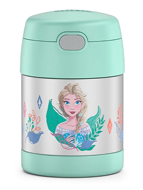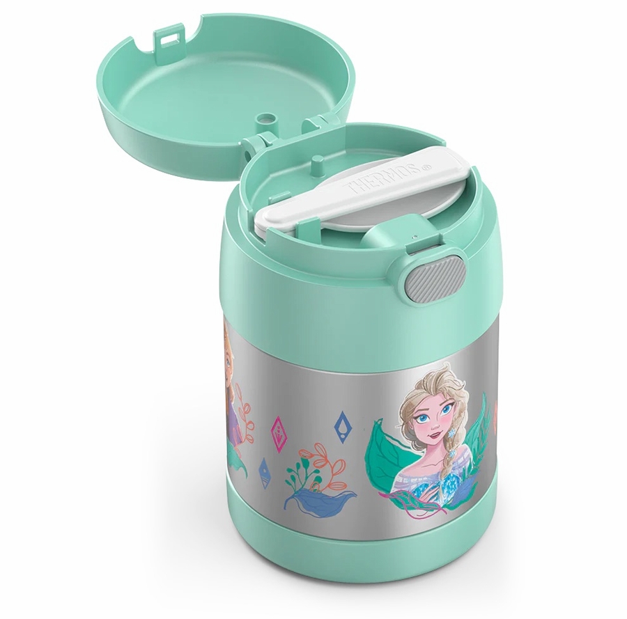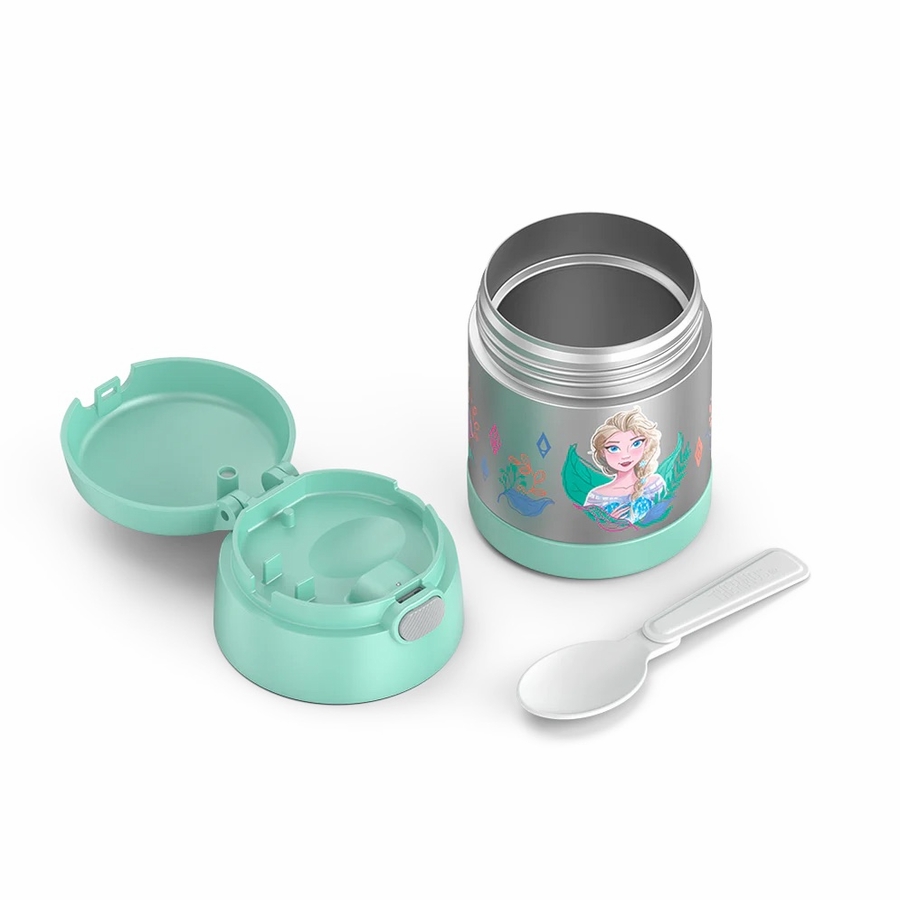 The 10oz FUNtainer® Food Jar from Thermos® brand is vacuum insulated to keep hot foods hot and cold foods cold-and since it's designed for kids it's also colorful and fun. Send them to school with their favorite soup so they can enjoy it fresh and hot at lunch time. If they're in the mood for a cold snack, pack it up with yogurt and berries, or apples and peanut butter. The FUNtainer food jar is light weight and compact with a push button lid so it’s easy to carry and open. To clean, you can pop your FUNtainer food jar in the dishwasher; however washing by hand is recommended. Spoon included.