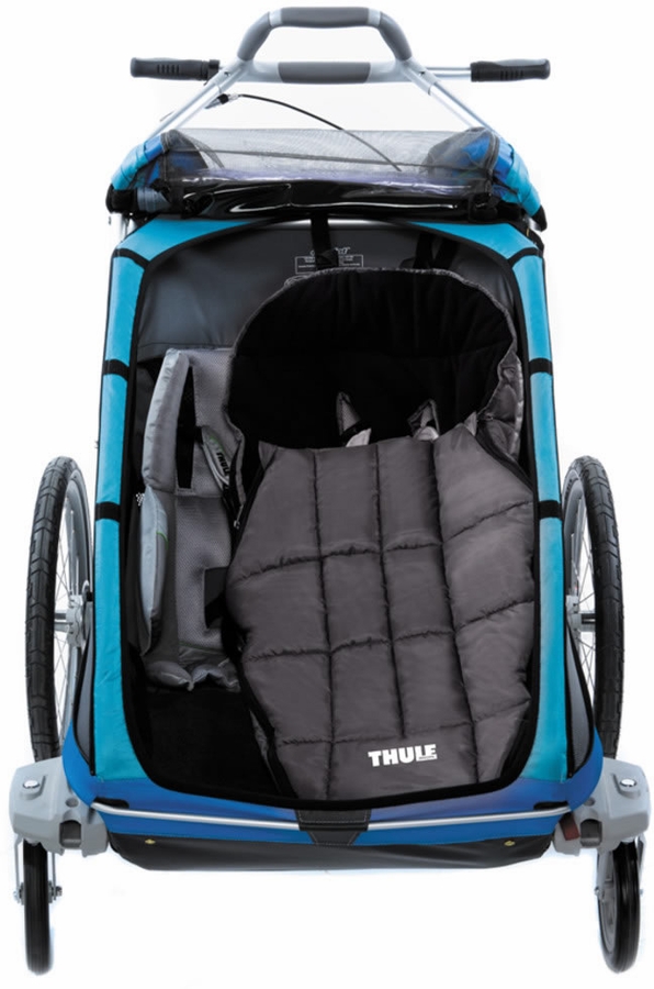 Great bag for cold, windy or rainy days! We used it with our Thule Double Chariot and the Thule double jogger. it's not designed to fit the double jogger but you can make it work. Our baby was super snug when she nordic skiied with us.