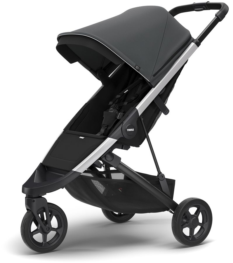 The Thule Spring is one of the most versatile and accommodating strollers I've owned. With its sleek design and adjustable handlebar, it was made for me. Yes, I am that dad you see jogging with baby and stroller in tow. I like to go on early morning runs and when the baby is up; he'll go with me. The three wheels and narrow width make it perfect for my development sidewalks and it is very easy to maneuver when I am on the side of the road. It's also easy to fit in and out of doorways. The stroller is one of a kind in my mind since it can be used for children up to 64 pounds and the handlebar adjusts up making it usable for any height. There's a 5-point harness and should be used for 6+ months. You can use a carseat with it - but you must purchase adapters. The seat reclines and there's a vented canopy with a see-through feature. There's also a storage basket that's fairly large and a footrest to climb in and rest your feet. The stroller is a very smooth ride. The wheels are foam filled so they will never blowout and they seem to absorb most shock.