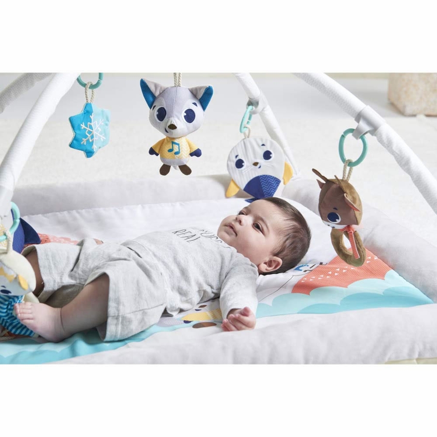 The gym?s colors and soft textures stimulate baby?s senses from the very first days. Use the special penguin tummy time pillow and textured seal mirror to help baby stay a little longer in the tummy time position.