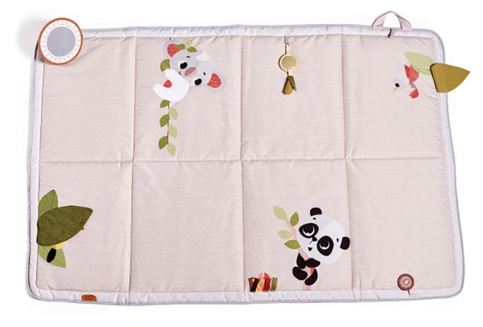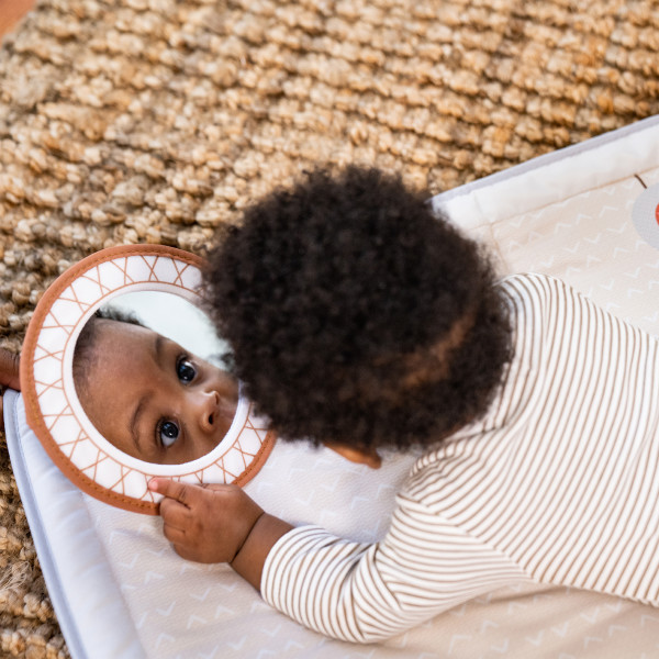 With its engaging peek-a-boo leaf, satin ribbons, tummy time mirror, detachable wooden rattle, earthy Boho Chic design and soft fabrics, this comfy padded mat complements your home's interior and creates a peaceful environment for babies to play and grow, bond and communicate.