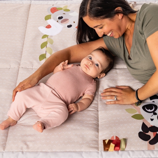 Large enough to play in with siblings, friends and parents, the mat's spacious design invites babies to explore movement: rolling, stretching and, later on, making their first attempts at crawling.