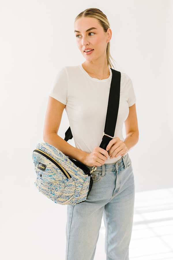 The Crossbody Strap is for decorative use only and should never be used when carrying a child. Before you’re back to baby-wearing with your Tushbaby, make sure to first detach the Crossbody Strap. Straps must always be safely stowed away in a zippered pocket when not in use in order to keep the straps safely away from the baby at all times.