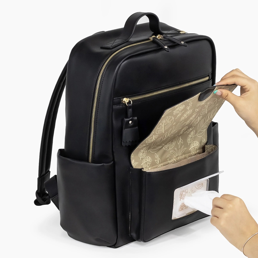 Whether you plan on using the backpack for diapers, travels, work—or all the above—its versatility makes it easy to carry as your everyday bag. And don't forget to take a 'PEEK' at what's under the front flap: you'll find a pocket specifically designed to fit a pack of baby wipes and an opening to easily pullout a wipe when needed. But if you'd rather use the space to hold other stuff, simply adjust the orientation of the inner flap (and voilà!) turn it into a regular pocket for your mommy goods.
